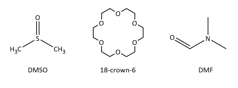 Now, we can see that DMSO which is an abbreviation for dimethyl sulfoxide, $18 - {\rm{crown}} - {\rm{6}}$ which is an example of crown ethers and DMF that is short for dimethylformamide; all three of them have bond dipoles but none of them have hydrogen attached to oxygen or nitrogen. So, we can say that all of them are polar aprotic solvents.