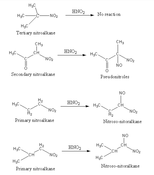 The nitroso-nitroalkane gives blue colour in sodium hydroxide solution whereas the pseudonitroles give red colour in sodium hydroxide solution and tertiary nitroalkane does not react with nitrous acid.