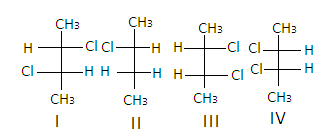 In the structure of$2,3 - {\text{dichlorobutane}}$, the structures I and III are diastereomers.
