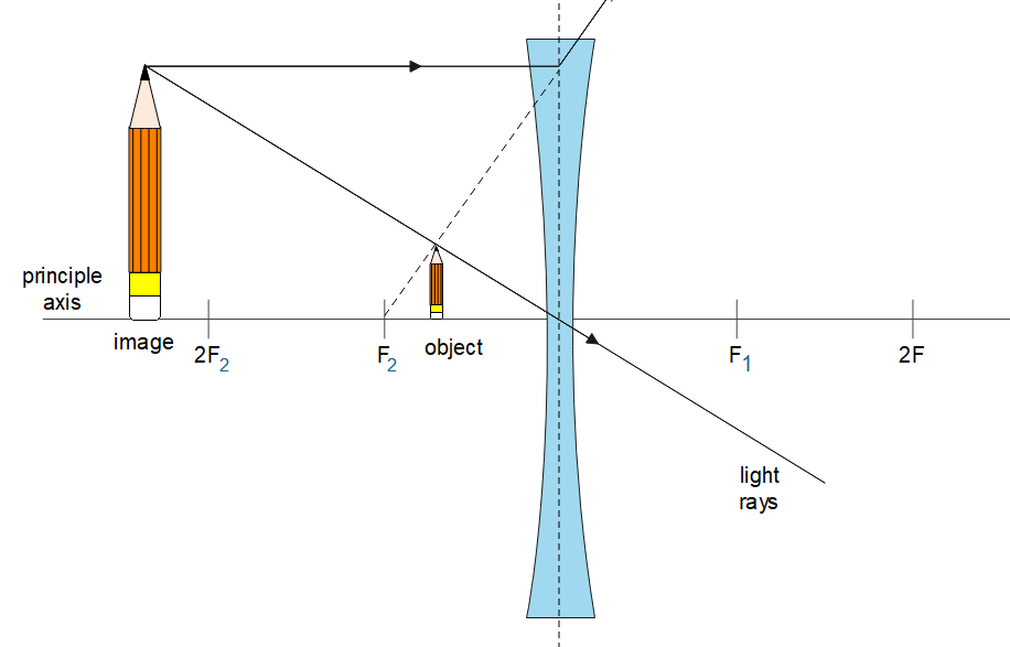 Place a pencil placed in front of a concave lens. First, ray emerges from top of the pencil and on the lens, it refracted and after refraction, it extended towards the backward direction and it appears to come towards a focus that is. Now the ray going toward the optical centre is going straight without being deviated.