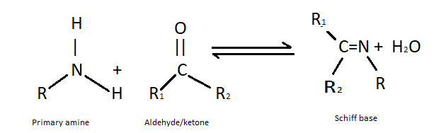 (ii) Formation of Schiff’s base- The formation of Schiff’s base is done by the condensation of primary amines and aldehydes in organic solvents. This reaction occurs under some basic conditions. It is used in anticancer activity, antiviral and antimicrobial. Schiff’s bases are very common ligands in organic chemistry . The general structure of Schiff’s base is ${R}_{2}C = N{R}^{'}$ where ${R}^{'} \ne H$. The reaction of formation of Schiff’s base is as follows: