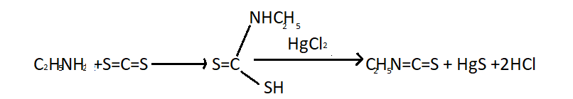 (i) Mustard Oil reaction- This is known as Hofmann mustard oil reaction. When primary amines are heated with alcoholic carbon disulphide followed by warming with excess of mercuric chloride from isothiocyanates having a pungent smell similar to mustard oil. Reaction of ethyl amine with carbon disulphide (\[S = C = S\]) produces ethyl isothiocyanate is given below: