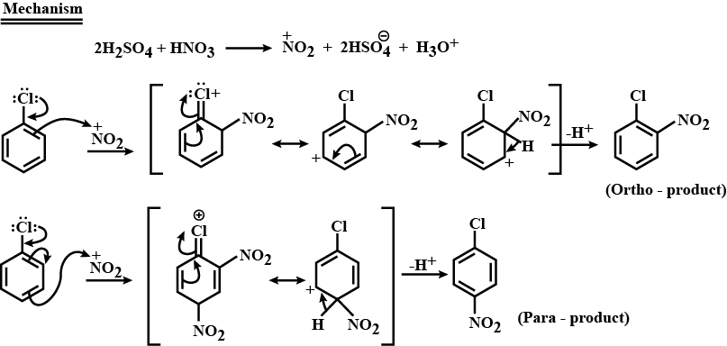 Complete step by step answer: Nitration of chlorobenzene is an electrophilic aromatic substitution reaction. Nitration takes place in the presence of concentrated nitric acid and concentrated sulphuric acid. The reaction between these two acids generates an electrophile called nitronium ion, \[{\text{N}}{{\text{O}}_{\text{2}}}^{\text{ + }}\] which is first step.
