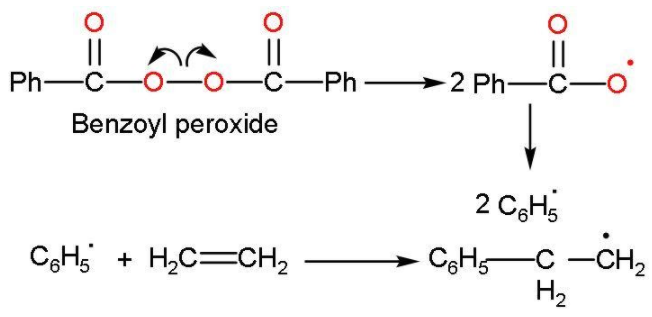 Step (1): Chain initiation steps: The sequence starts with generating free radical of phenyl formed by the peroxide to the ethene double bond, which breaks the radical thus generating a new free radical and this is called chain initiation step. This takes place like