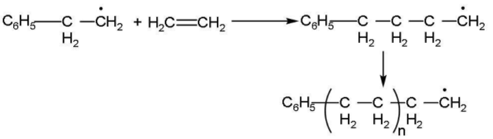 Step (2): Chain propagation step: Now, the radical formed reacts with another molecule of ethene forming a bigger size of radical. The repetition of this sequence with new and bigger radicals carries the following reaction forward. This step is followed as: