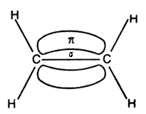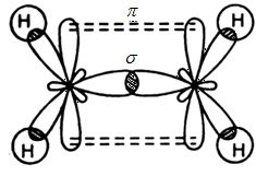 - In ethylene the carbon atoms are of $s{{p}^{2}}$ hybridized . They are attached to each other by one $\sigma $ bond and a $\sigma $ bond. The $\sigma $ bond is obtained by the overlap of $s{{p}^{2}}$ hybrid orbital and the $\pi $ bond is obtained by the overlap of unhybridized p orbitals.