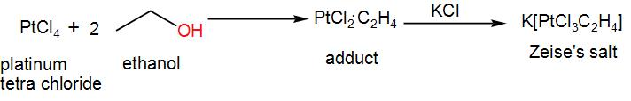 Here we use the transition metal, platinum for the preparation of this salt. When platinum tetrachloride reacts with ethanol, it forms an adduct. If we add potassium chloride to this adduct, we obtain Zeise’s salt. We can write the reaction as-