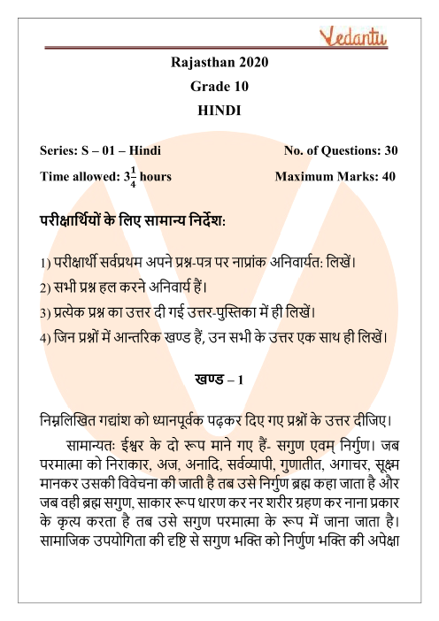 FAQs on RBSE Class 10 Hindi Question Paper 2020