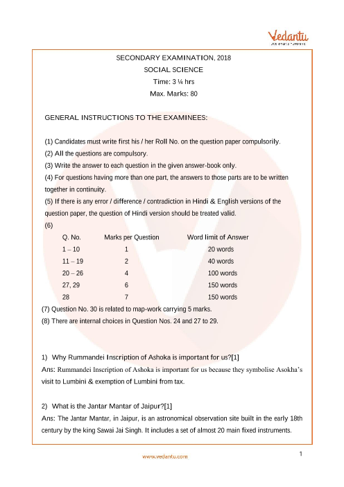 Rajasthan Board Social Science Class 10 Question Papers 2018 with Solutions - Free PDF Download