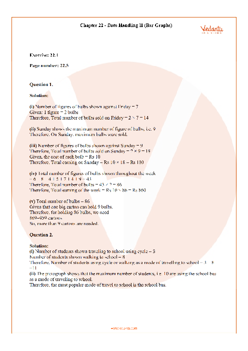 RD Sharma Class 6 Chapter 22 - Data Handling II (Ex 22.2) Exercise 22.2 is a topic that can confuse many students. Vedantu provides solutions for this exercise which help you in solving this exercise more efficiently. Solutions provided are designed by the subject matter experts and therefore they are very trustworthy. These solutions will help you save time as you will not have to run from pole to pole looking for solutions to every question separately. These solutions are prepared as per the CBSE standards hence you can trust the method as well.