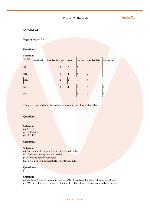 Exercise 7.1 introduces the foundational concepts of decimals. The solutions provide step-by-step methods for the following types of questions: