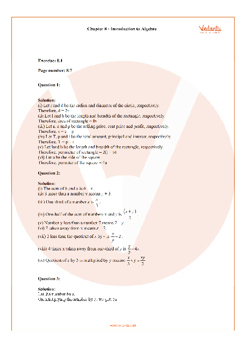 RD Sharma Solutions for Class 8 Maths Chapter 8 - Introduction to Algebra are provided on the Vedantu website, which is considered to be one of the most important and highly beneficial study materials for the students of CBSE Class 6. The solutions provided at Vedantu are formulated in such a manner that every step is explained in a simple and precise manner. The RD Sharma Solutions found on the Vedantu website are prepared by professional teachers after conducting extensive research on each concept with the aim of providing the best material and resources to the students for effective learning. Students can access the materials by visiting website.