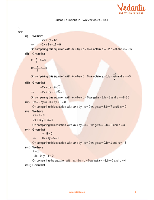 If you are a Math lover, you can go for practising the tough as well as the easy problems. If you are one who distances yourself from Maths you should first start solving easier problems and slowly start progressing with attempting different questions. What is necessary is that you should have the solutions for this exercise beforehand. This helps you to understand your mistakes and rectify them immediately. You can easily get the solution of the Linear equation in two Variables Exercise 13.1 from the Vedantu app or website. It provides you with solutions that have both shortcuts as well as detailed explanations.