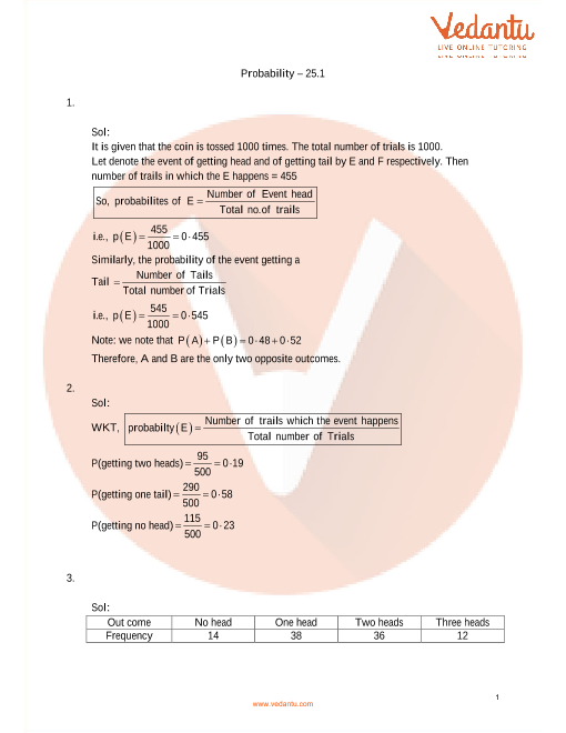 In question 2 of Class 9 RD Sharma Chapter 25, Probability, exercise 25.1, the students need to calculate the probability of getting two heads, one tail, and no head. The total number of trials in the question is 500, therefore the probability of getting two heads will be 95/500, that is, 0.19. The probability of getting one tail will be 290/500, that is, 0.58 and the probability of getting no head will be 115/500, which is equal to 0.23.