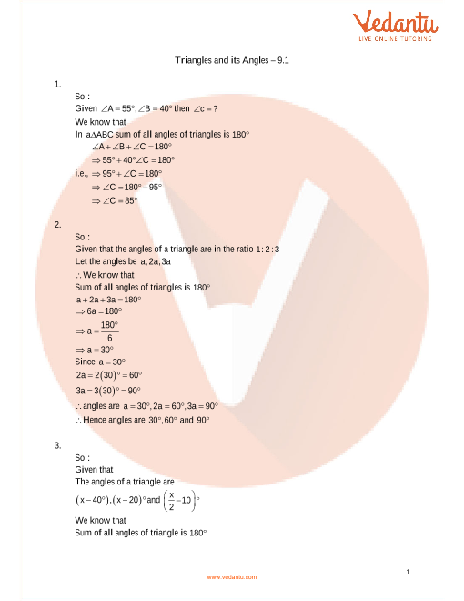 The name of the 9th Chapter in RD Sharma Class 9 Maths is Triangle and its Angles. This chapter consists of 3 exercises. You will find the PDF of all the questions of these exercises on the Vedantu website. All these solutions are prepared by Vedantu's Maths expert teachers. These solutions have been prepared in a detailed way so that students are easily able to understand all the steps used in them.