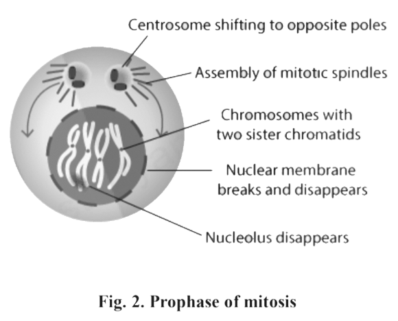- Prophase: Chromatin condenses; nucleus and nucleolus disappear; spindle fibres form.