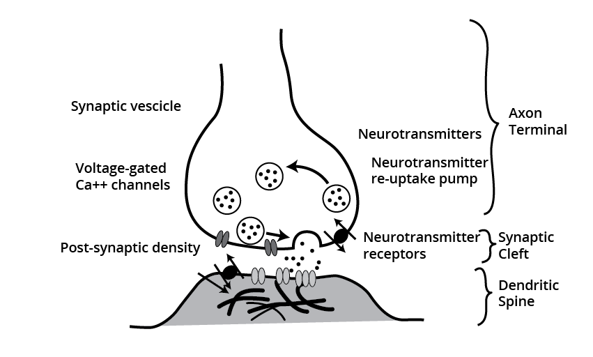 In chemical synapses, pre-and post-synaptic neurons are separated by a fluid-filled space referred to as synaptic cleft. There are neurotransmitters involved in these synapses. There are axon terminals present which contain vesicles that are filled with neurotransmitters. By the time, the impulse reaches the axon terminal, synaptic vesicles start moving towards the membrane and fuse with it. This leads to the discharge of the neurotransmitters from the synaptic cleft. Now, the neurotransmitters bind with the receptors which are present on the post-synaptic neuron. Thus, ion channels get opened and it results in the transmission of fuse nerve impulses.