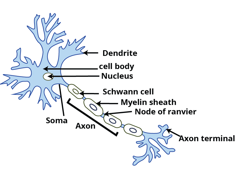The cell body is made up of cytoplasm that contains granular bodies called Nissl’s granules. Short, several, finger-like projections that arise from the cell body are called dendrites. Dendrites carry nerve impulses towards or into the cell body. Axon is a long, single structure whose distal end is branched. Each of the axons ends into a bulb-like structure known as the synaptic knob, which contains neurotransmitters. The cells of the axon which produce and cover the myelin sheath are known as Schwann cells. The interruption between the two-adjacent myelin sheath is known as Nodes of Ranvier.