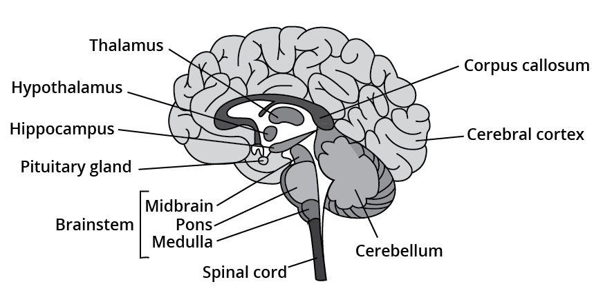 The forebrain consists of 3 parts- cerebrum, thalamus, and hypothalamus. The cerebrum is considered to be the largest part of the brain. The division of the cerebrum into two halves is known as the left and right cerebral hemispheres. These hemispheres are joined by a great white central canal white commissure called the corpus callosum. The covering of cerebral hemispheres by a layer of cells is known as the cerebral cortex. The thalamus is the area present at the center of the forebrain. It is involved in sensory and motor signaling. Hypothalamus lies at the base of the thalamus. The urge for eating, drink, and body temperature is all controlled and regulated by it.