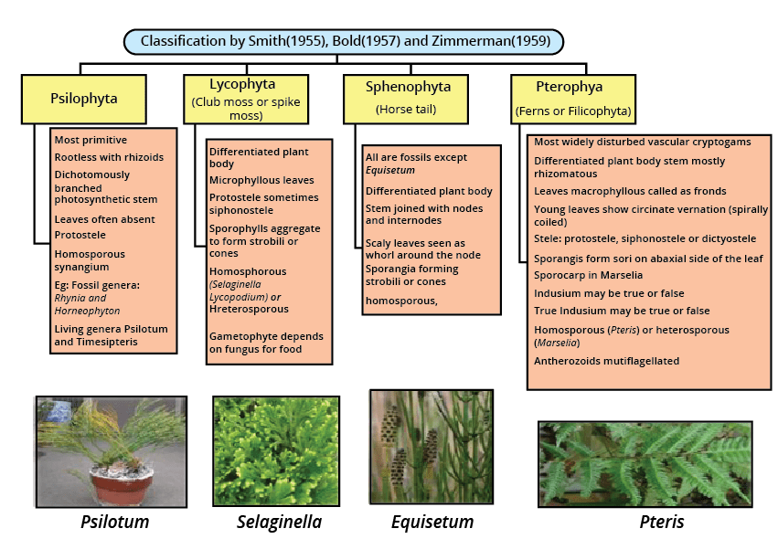 - Pteridophytes: The first terrestrial plants with vascular tissues (xylem and phloem). Examples include ferns.