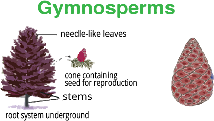 - Gymnosperms: Plants that have naked seeds not enclosed within a fruit. Examples include pines and cycads.