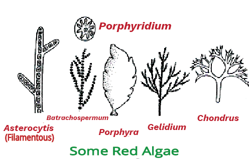 - Rhodophyceae (Red Algae): Major pigments are Chlorophyll a, d, and phycoerythrin. Food is stored as floridean starch. They reproduce asexually using non-motile spores.