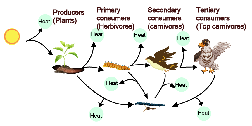The 10% law states that only about 10% of the energy is transferred from one trophic level to the next, with the remainder lost as heat. This principle clarifies why there are a limited number of trophic levels and why energy pyramids are always upright. Mastery of this concept is crucial for reasoning and HOTS questions in board exams.