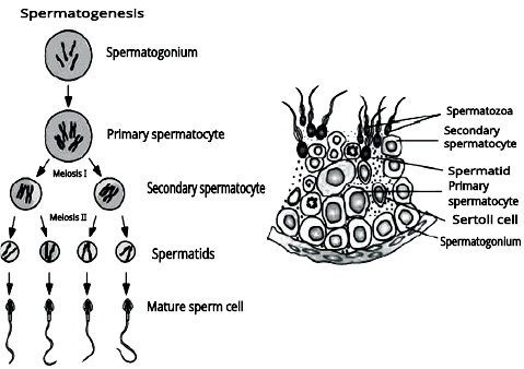 (ii) The spermatogonia undergo meiotic divisions which leads to formation of sperms (the male gametes). Sertoli cells are present in between the germinal epithelial cells of the seminiferous tubules and these cells provide nourishment to the developing spermatozoa (sperms)