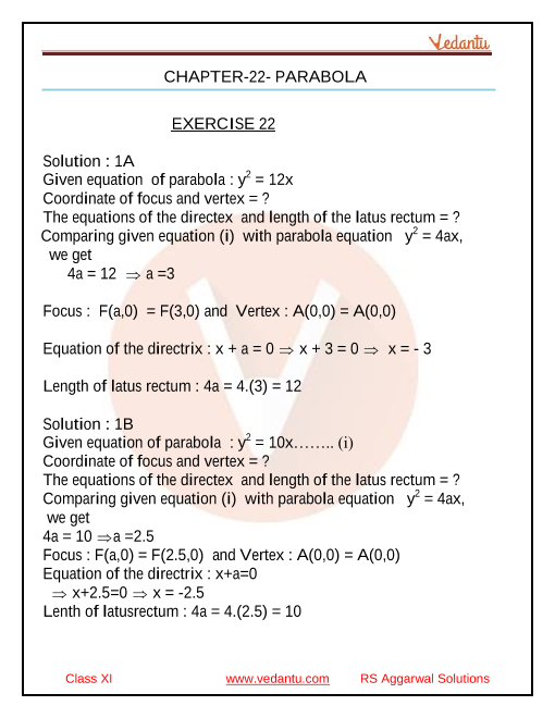 Class 11 RS Aggarwal Chapter-22 Parabola Solutions - Free PDF Download