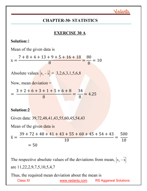 Class 11 RS Aggarwal Chapter-30 Statistics Solutions - Free PDF Download