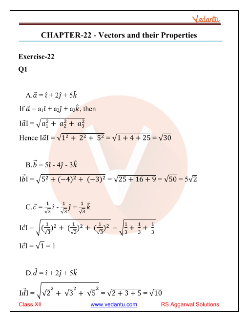 1. What key topics are covered in the RS Aggarwal Class 12 Maths Chapter 22 solutions on Vectors and Their Properties?