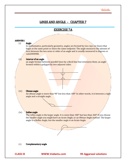 The syllabus followed through the RS Aggarwal Class 9 Solutions Chapter-7 Lines and Angles is the CBSE syllabus. Before noting down the questions and the answers it is taken care of that the current syllabus and its research is done so that when the solution is accessed by the students they only get the latest information. Vedantu RS Aggarwal Class 9 Solutions Chapter-7 Lines and Angles contains a procedure through which the answer for each question is provided. The experts first go through Chapter 7 Angles and Lines and understand the concepts and then make sure that the answers provided in the solutions are the right ones or not.