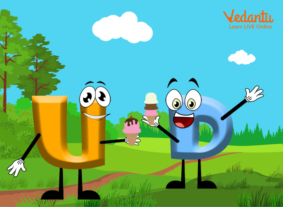 Letter U and Letter D smiling happily.