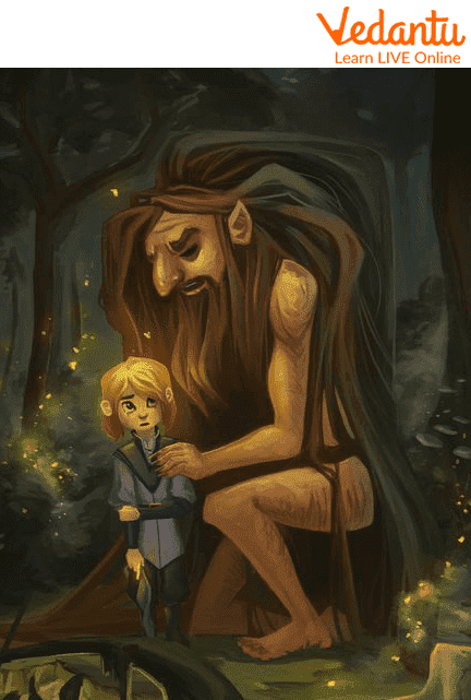 Years later, a travelling explorer accompanied by a dog learns of these perilous woods and requests permission to hunt in the forest, claiming to be able to find the fate of the previous hunters. The man and his dog are permitted entry. A gigantic arm drags the dog beneath the water as they approach a lake in the middle of the woodland. The hunter returns to the jungle the next day with a party of men to drain the lake. They discover a naked man with iron-like skin and long shaggy hair covering his entire body. They grab him, and he is confined in a cage in the courtyard as a curiosity. The king declares that anyone who sets the wild guy free will be killed.