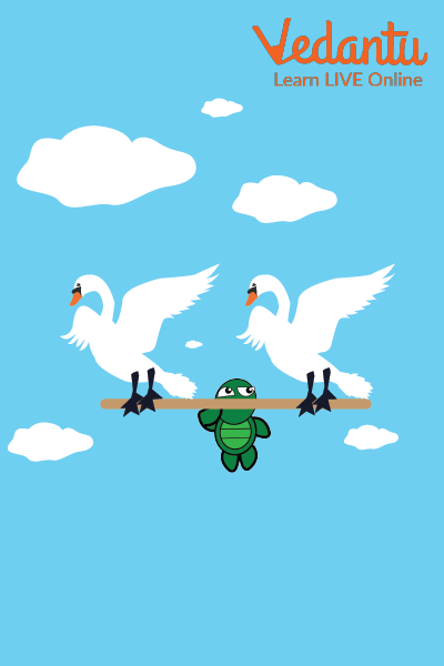The swans decided to move to another location. The turtle asked the swans to take him alone. The swan proposed a scheme in which the turtle held a stick in its mouth, and the swan grabbed both ends of the stick. They told the turtle not to talk, or he would fall and die. The turtle understood and promised not to open the frontage for this journey. Passing through the village, many people were surprised to see turtles. They yelled at the turtles and teased them. The tortoise got angry and opened its mouth to say something. However, when he opened his mouth, he fell to the ground. The swans were very shocked to see their comrades dead. The turtle died of impatience and stupidity.