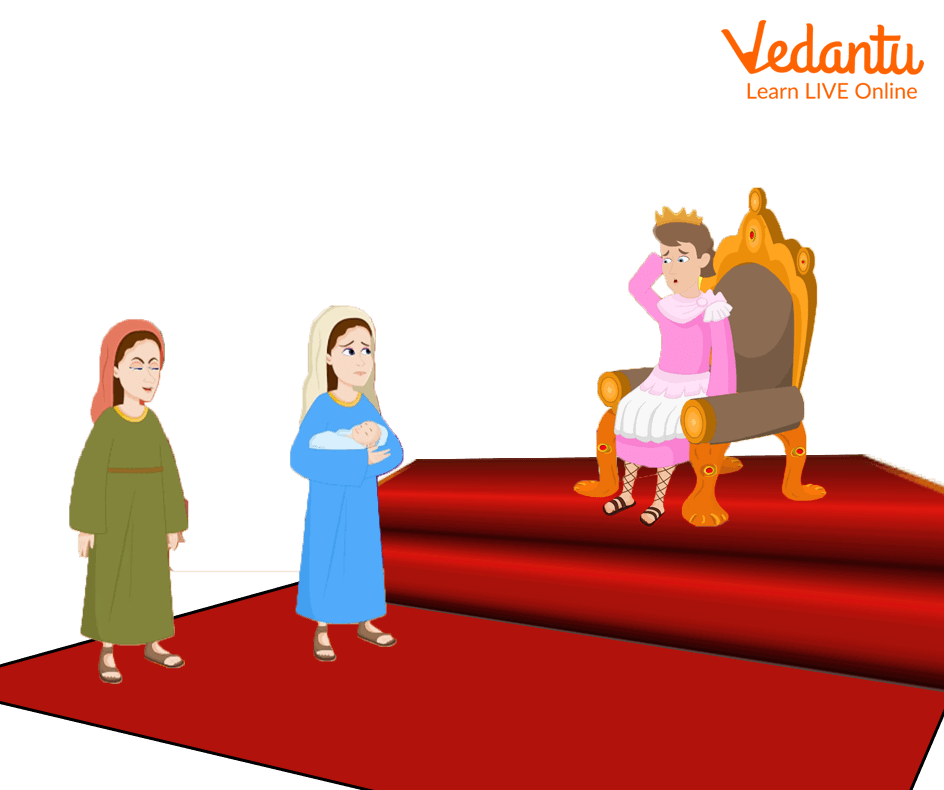 One of the women was taken aback when she heard this. She pleaded, "No, my king." "Don't do that, the boy will die." Kindly give the boy to the second woman, but do not murder him."