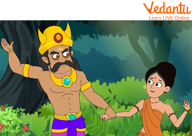When Sita protests, Ravana lifts his sword to behead her. By clutching Ravana's hand, Mandodari manages to save Sita. She asserts that because hurting a woman is a terrible act, Ravana shouldn't do it. She requests that he stop thinking about taking Sita as his wife and instead amuse himself with his other women. Despite saving Sita's life, he remains adamant about wanting to wed her.