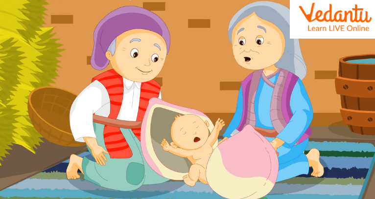 The old man looked at it with astonishment and replied, “It is the biggest peach that I have ever seen, my dearest. Where did you get it?” His wife told him the entire story and then they decided to cut the peach and eat it. Right when they were about to cut it, the peach split into two halves, by itself. A serenely beautiful child came out of the peach.