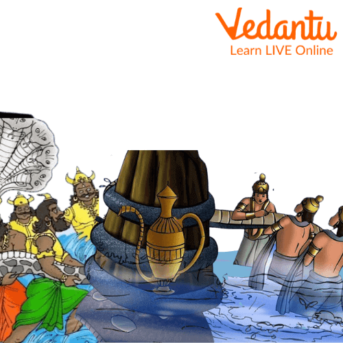 The Asuras were left out in the open on the dry ocean floor while the great sage exhaled in pleasure. They were attacked by the Devas. The Asuras were defeated and left the conflict. The Devas exclaimed happily.
