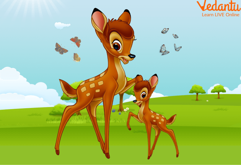 Long ago, in a forest, there lived three baby deer with their Mamma deer and Papa deer. One bright summer day, in the month of June, the Mamma deer gave birth to her fourth baby. The little fawn had big beautiful eyes and a loving smile. The Mamma deer named the cute little fawn Doe.