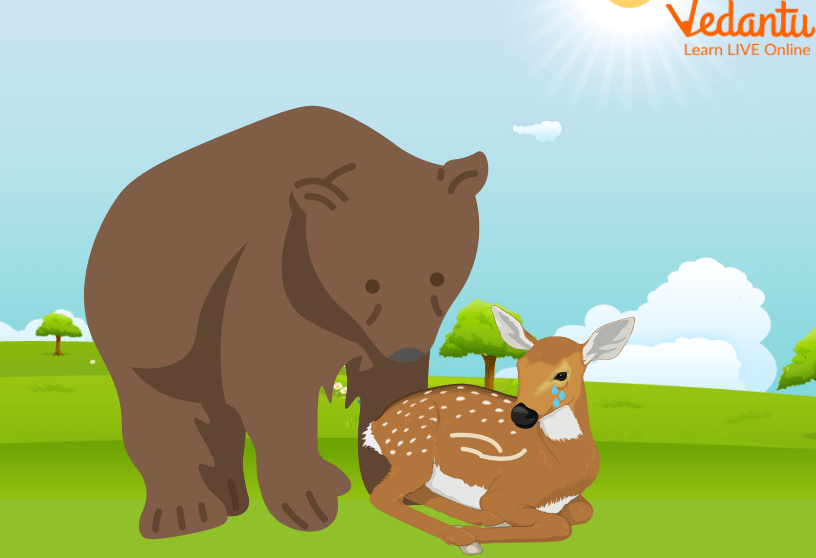 Doe was ecstatic as she ran in the fresh air. Little did she know, while galloping happily, that her glee was going to vanish the very next minute. She stumbled on a large boulder that stood in the grassy plain and fell down. Her left leg was hurt badly. So she burst into tears. Tears rolled down the cheeks of the little fawn Doe, as the monkey massaged his leg. The baby bear picked her up and hugged her tight. She still could not stop crying.