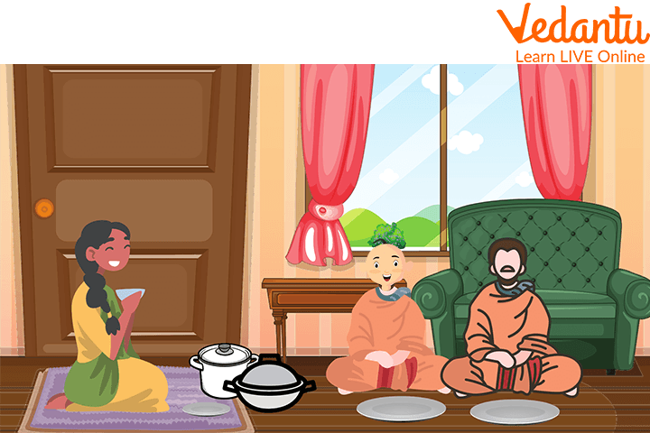 When the child woke up he said “It is raining. Let’s go inside the house and have dinner”. After entering the room he changed the clothes of his son and gave him rice and brinjal curry for dinner. Tenali Rama told his wife loudly, “It was raining outside, let the boy sleep in the room”.