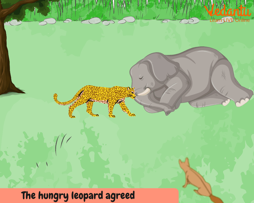 Finally, a leopard comes, and the jackal now weaves a brilliant story that would help him get the tough part of the elephant's skin broken down and also allow him to devour the whole animal. The Jackal tells the leopard that he seemed hungry and is welcome to have a bite of the dead elephant which was killed by a lion. The jackal also promises that if he sees the lion coming, he will warn the leopard so that the leopard can run away and escape the wrath of the lion. The leopard started cutting the elephant's tough hide, and as soon as he was done, the jackal shouted that the lion was approaching. This made the leopard run away without taking a bite of the elephant. The jackal then happily feasted on the dead elephant for many days.