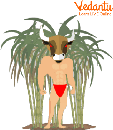 He holds the head of a cow and the body of a man. (He is the "Cow Head" or "Gozu"). The hungry villagers started attacking him eventually and ended up brutally killing him, ripping up his body, and then eating him.