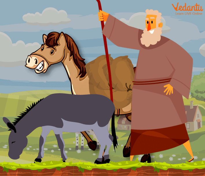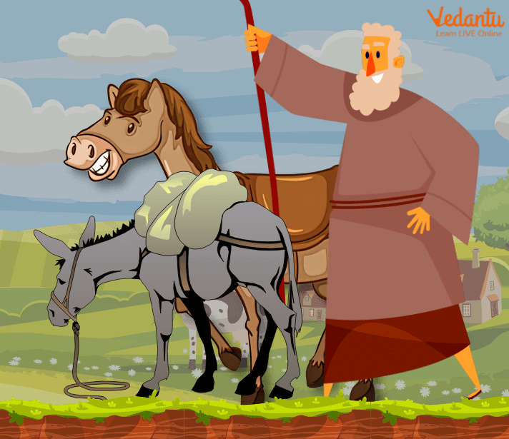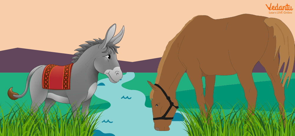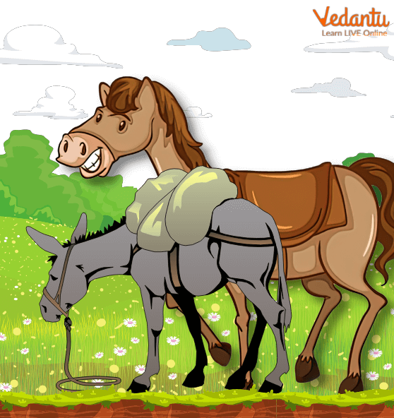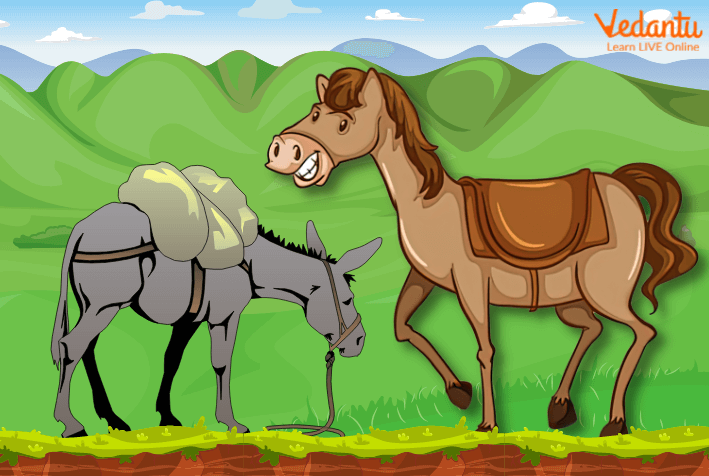 The horse that belonged to the washerman was very pretty. It was very proud of its beautiful mane and never had to carry any load. The washerman used to visit the market and the other faraway places riding on the back of his horse. One sunny morning, the washerman was to go to the village to return the washed clothes to the villagers. He had put all the bundles of clothes on the back of his donkey, while he did not put any load on the back of his horse. The heavy load of clothes seemed to be unbearable for the donkey, but it did not say a word. It kept walking with the load.