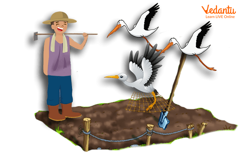 The story of the farmer and the stork is related to a farmer who plants traps in his field to catch the cranes that were stealing the seeds he had sown.