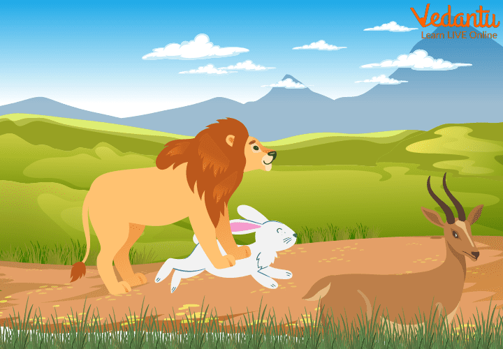 The king of the jungle had eaten nothing for the last two days. The lion’s mouth was dry with thirst. He started walking and went to the nearby river and drank some water. After drinking the water, he felt better. He then started searching for a portion of food, and after some time, he found a hare eating grass.