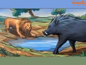 Seeing this, the lion roared, “I am the king of the jungle, I will drink water first, you have to wait till I quench my thirst.” After listening to the lion, the boar said, “I don't care, I came here first so it is my chance to drink the water first. Let me quench my thirst first.”