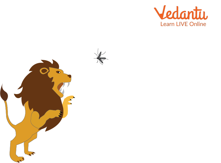 Out of nowhere, a gnat appeared and started disturbing the lion. The lion did not pay attention at first. To make him annoyed, the gnat started to buzz around his ears and nose.