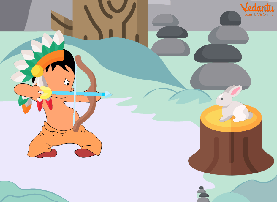 Little Hiawatha went hunting one day and when he came upon a rabbit, he got out his bow and arrow. The rabbit, however, scurried away and hid in his burrow before he could fire.
